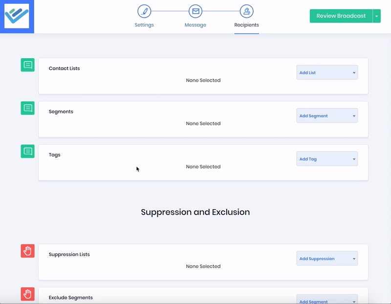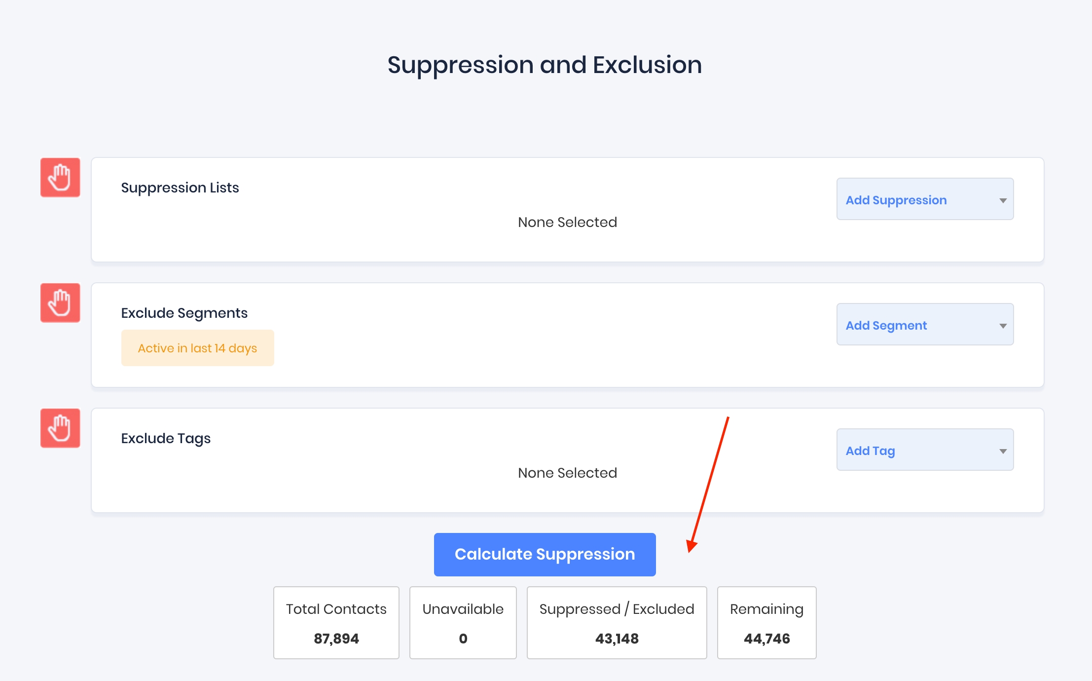 Verify the total number of contacts who will receive your broadcast by clicking the "Calculate Suppression" button at the bottom of the Recipients page.