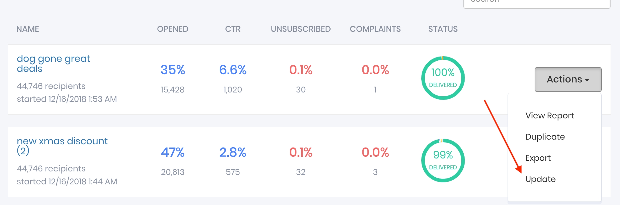 Click the action button on a broadcast, select "Update", this can be done on both completed and running/active broadcasts.