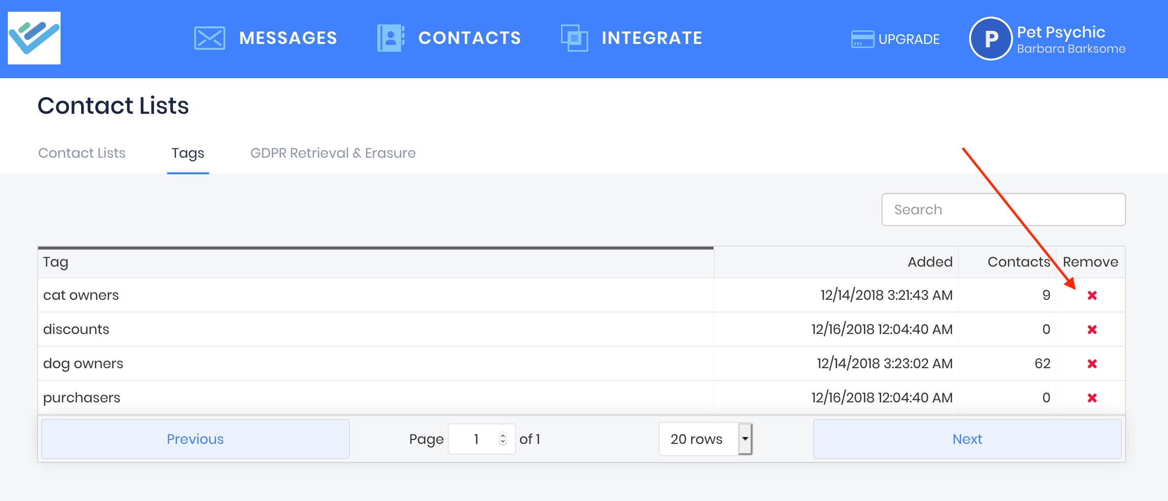 Click the red X to delete a tag, which will untag all it's contacts