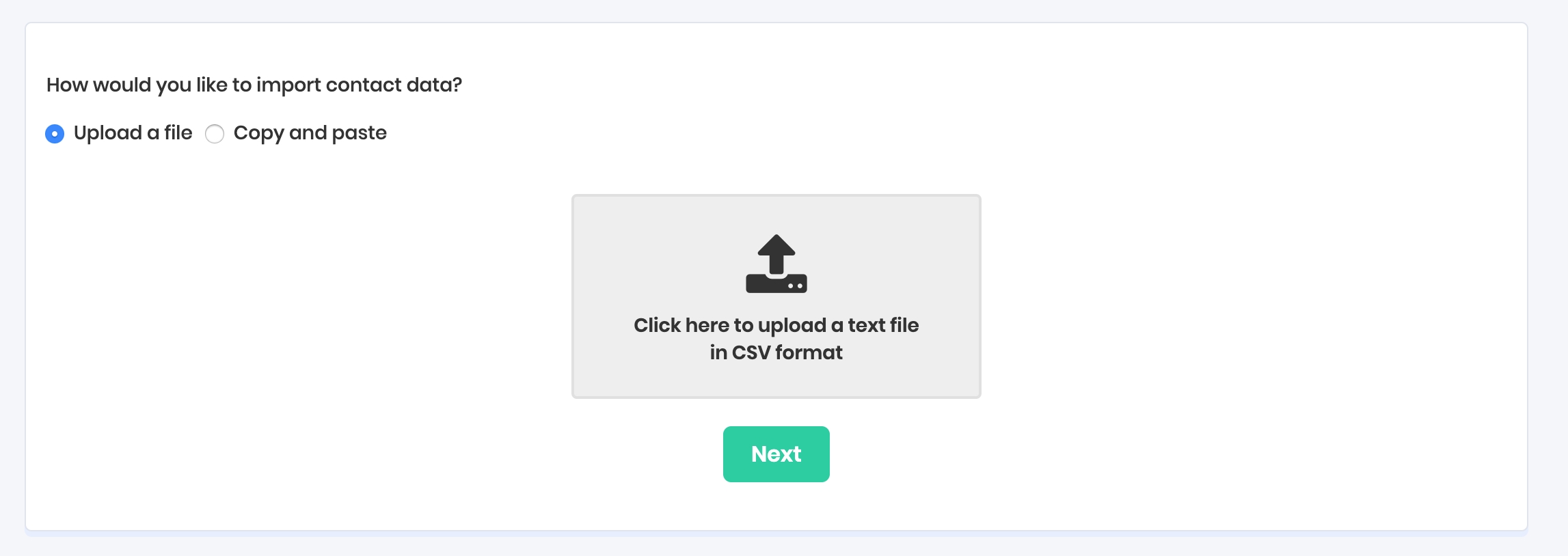 To upload your contact list in CSV format, you can either drag and drop the file onto the upload widget or click to browse and select your contact list from the file manager.