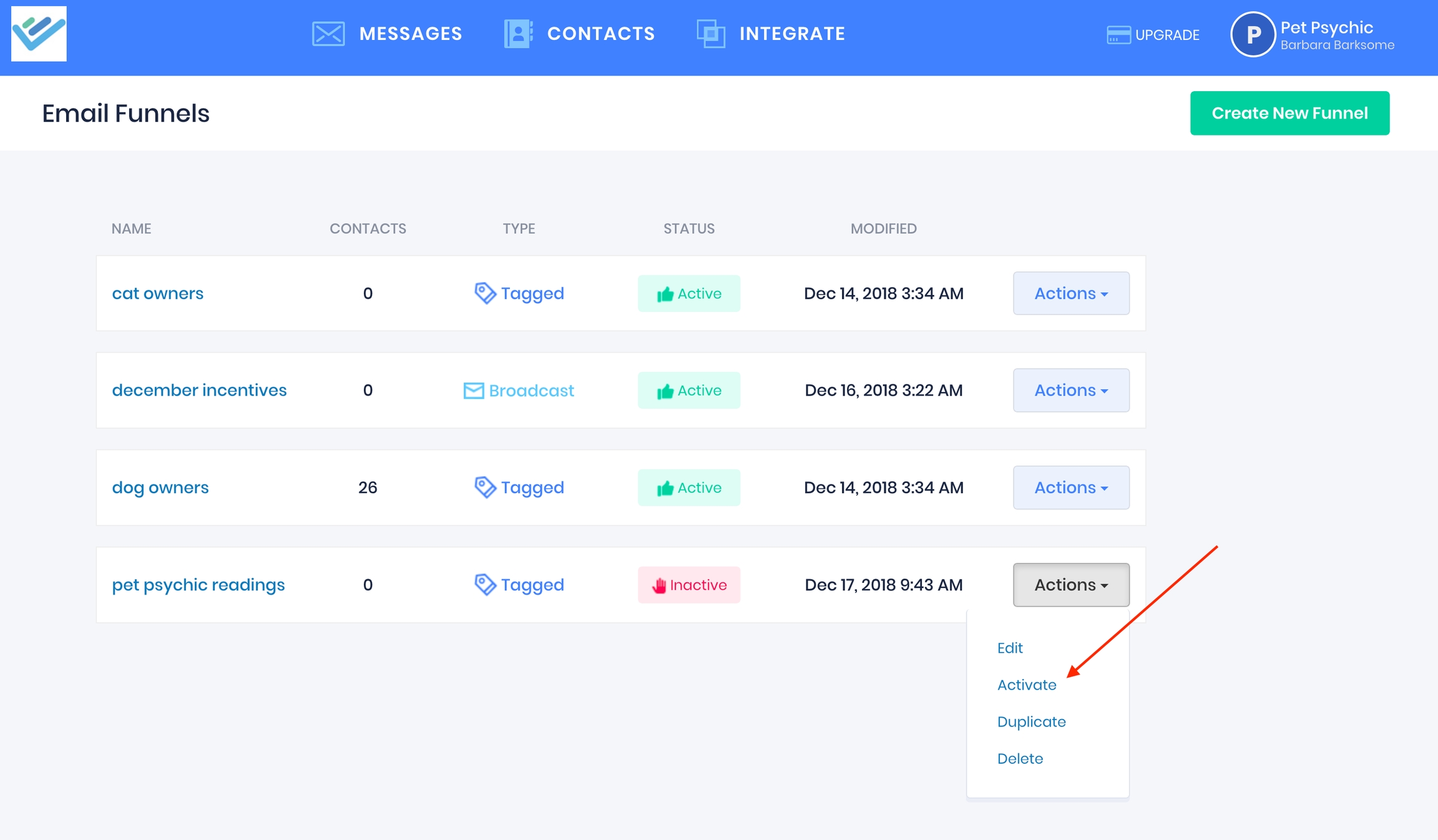 Your funnel is disabled by default, click the action button and select activate to make your funnel active