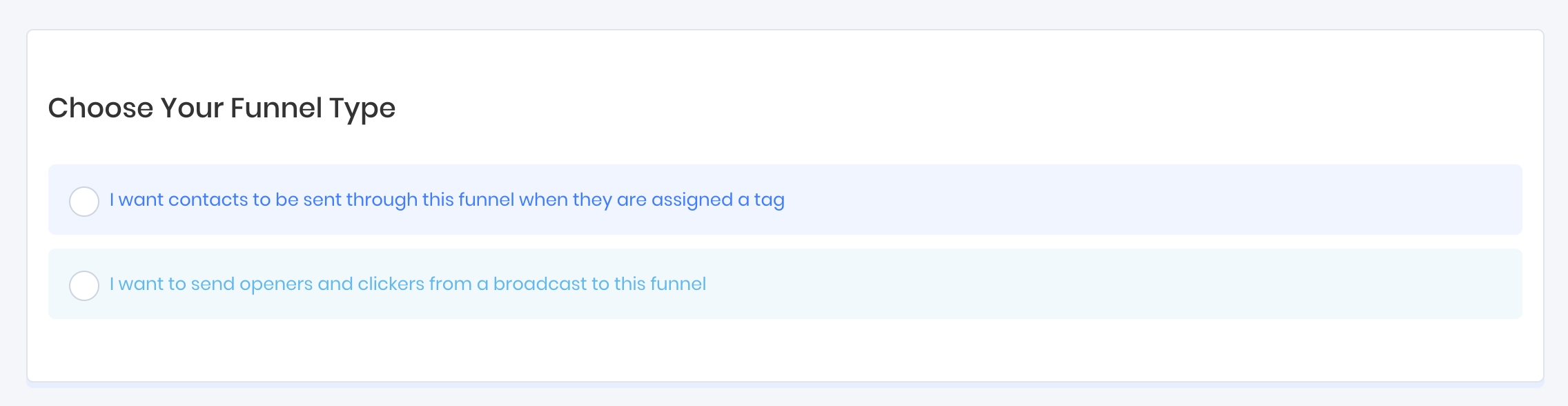 Choose "i want to send openers and clickers from a broadcast to this funnel " to make the funnel appear as an option in the dropdown on the broadcast review page of your broadcasts.
