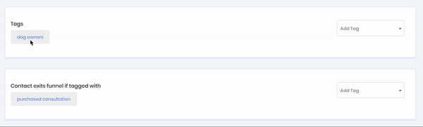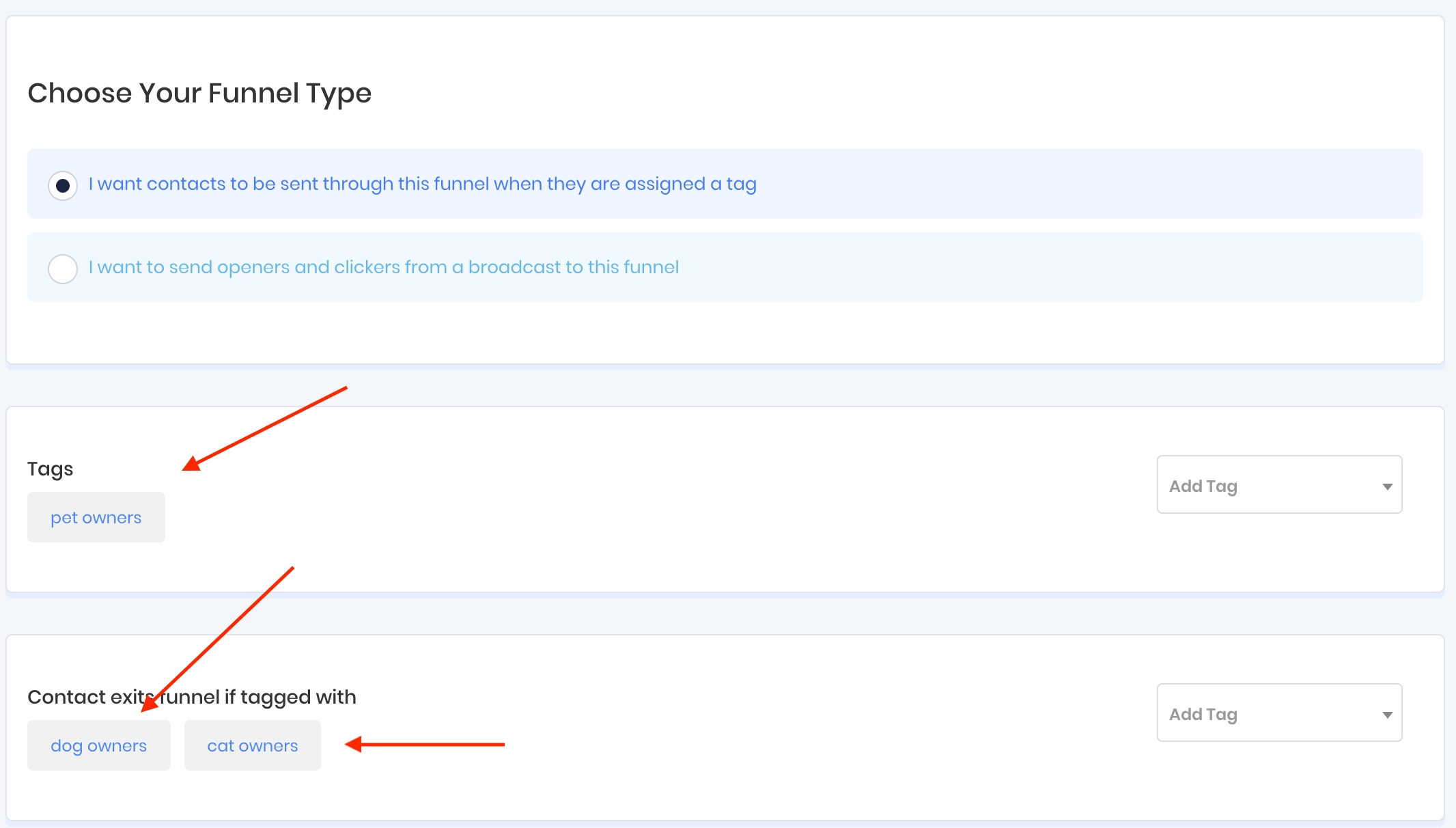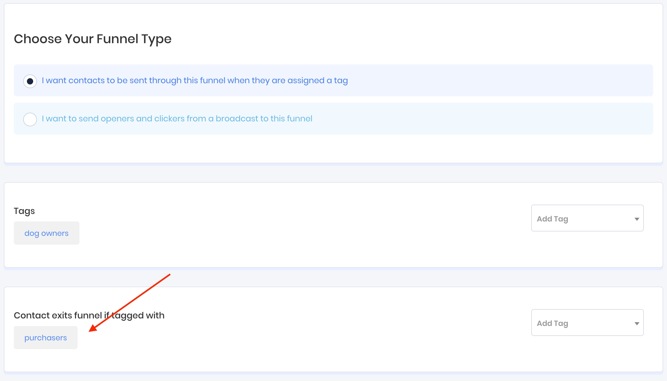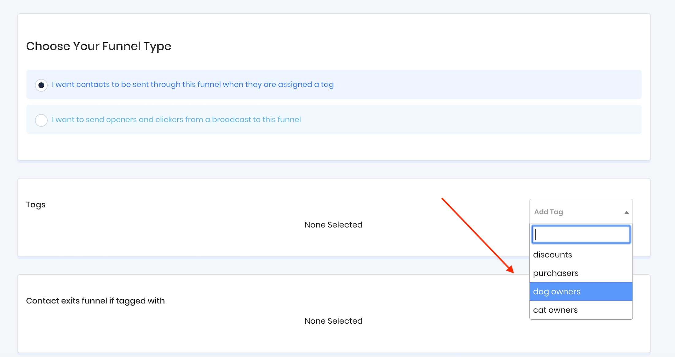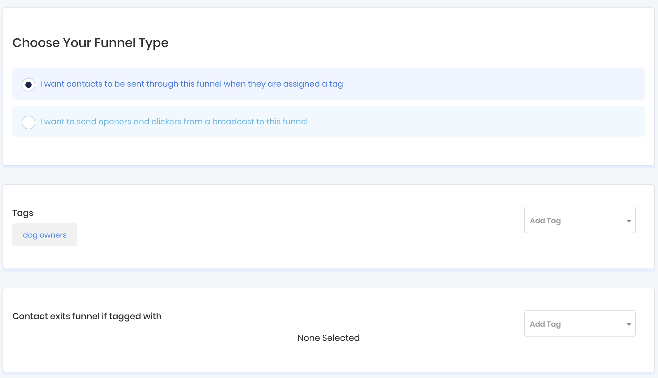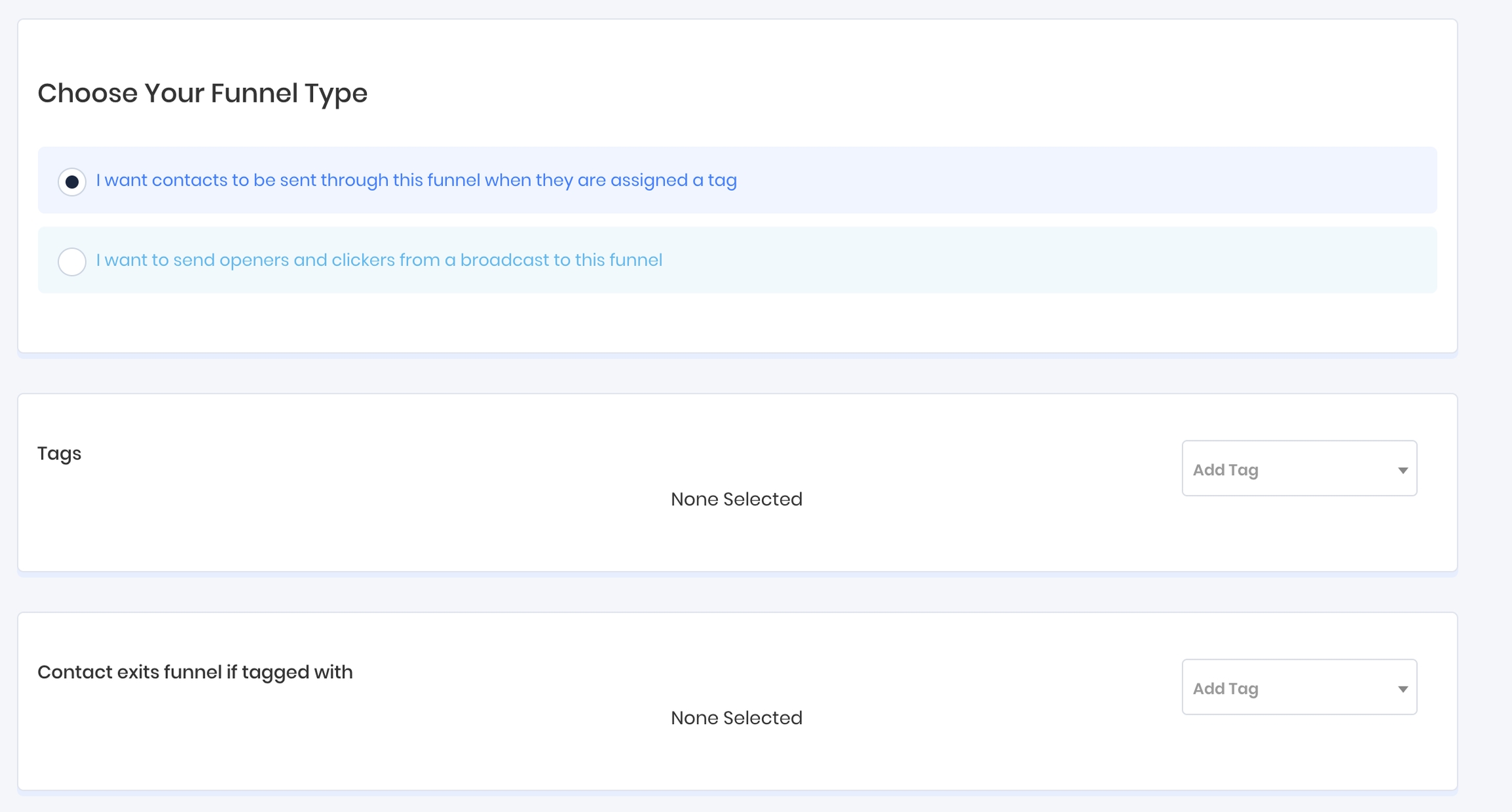 Choosing " I want contacts to be sent through this funnel when they are assigned a tag" creates many possibilities and contexts for adding contacts to a funnel.