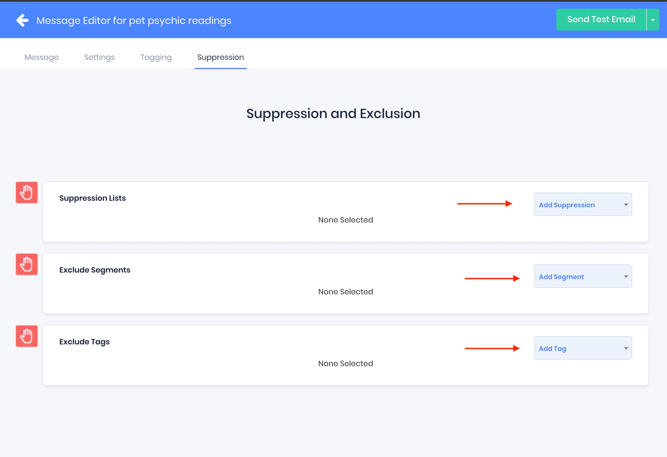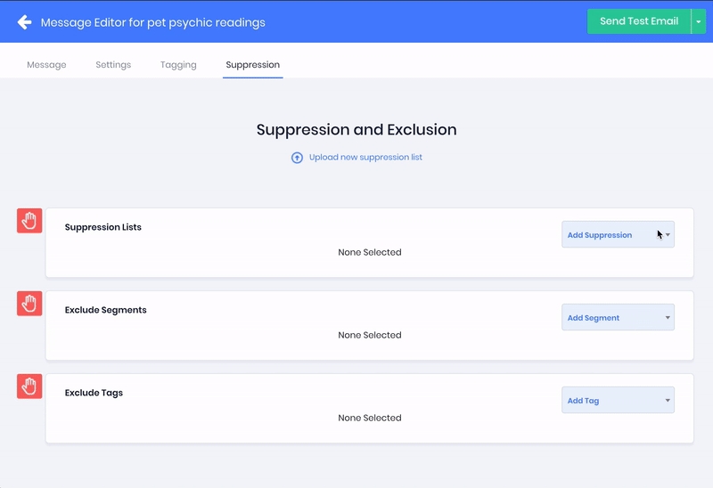 You can exclude and suppress contacts from receiving a funnel message by selecting suppression lists you've previously uploaded, or by selecting segments or contacts that have had a tag applied to them
