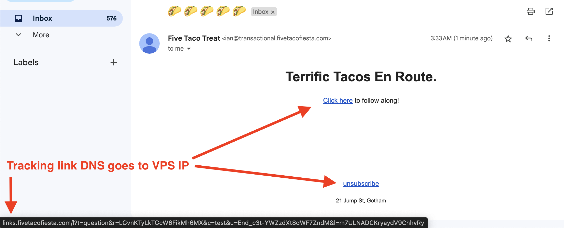 In our example Gmail message with white-labeled tracking below, the sending subdomain's base domain is fivetacofiesta.com, so the white-label link domain is subdomain links.fivetacofiesta.com.&#x20;