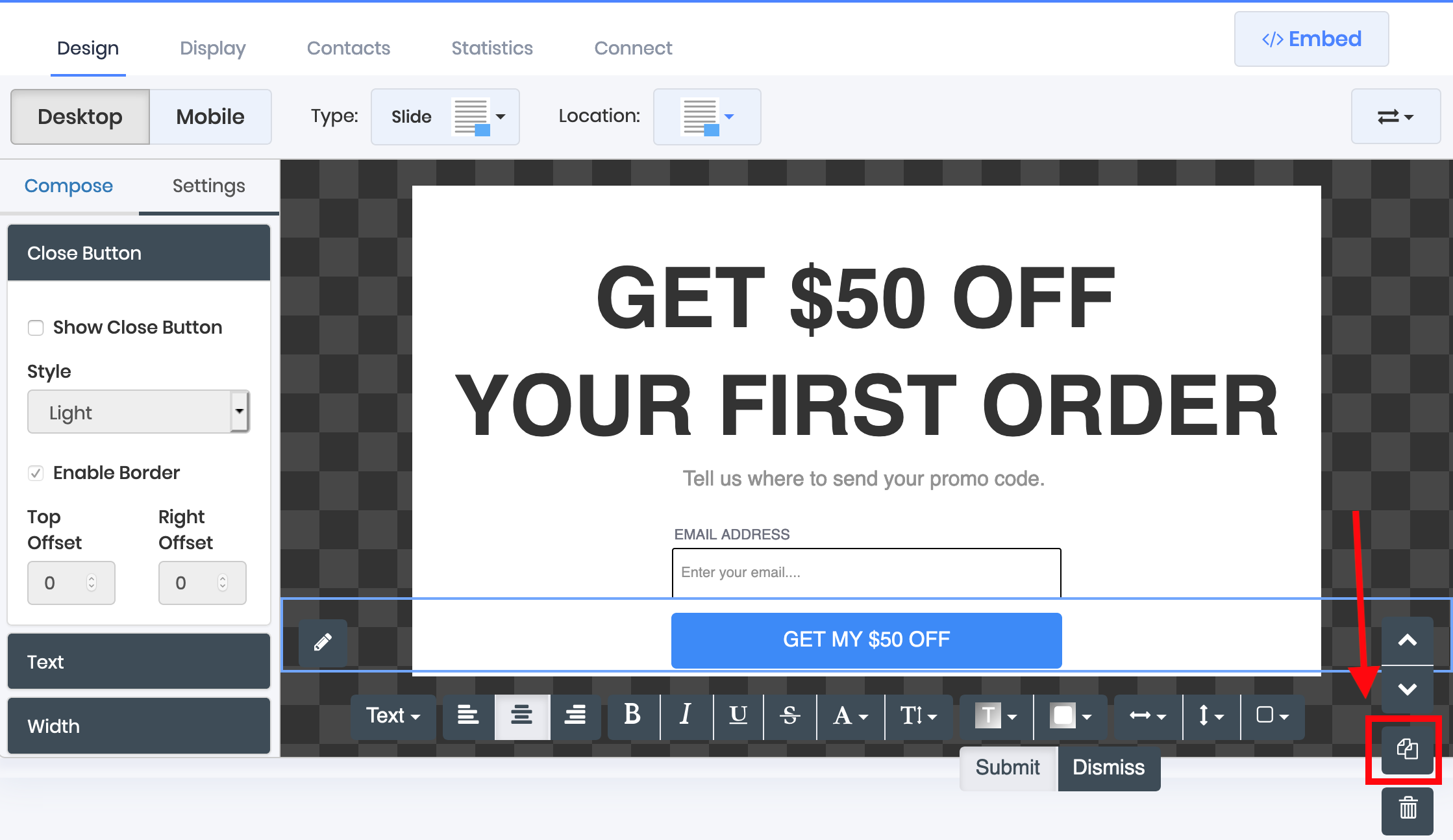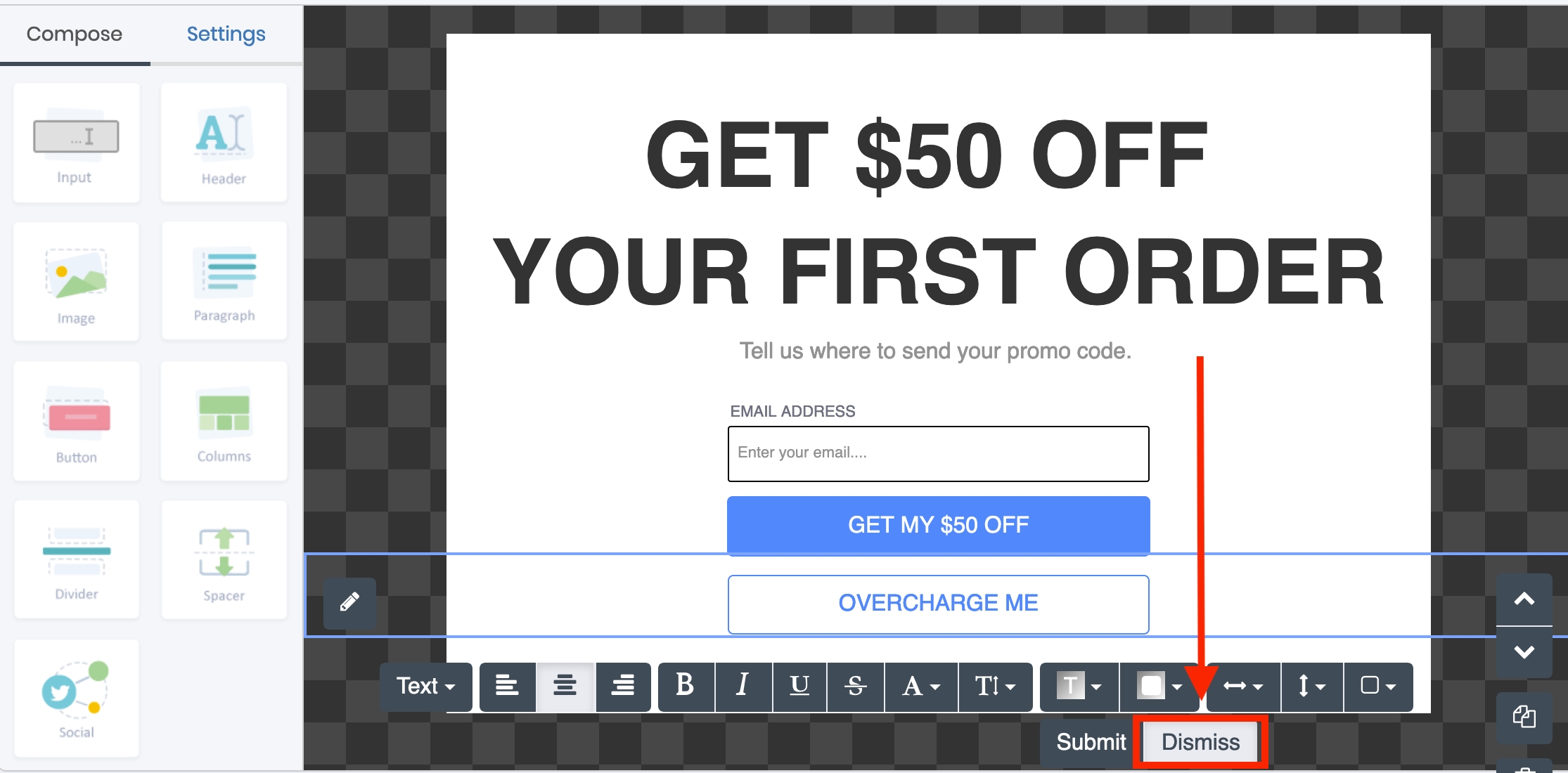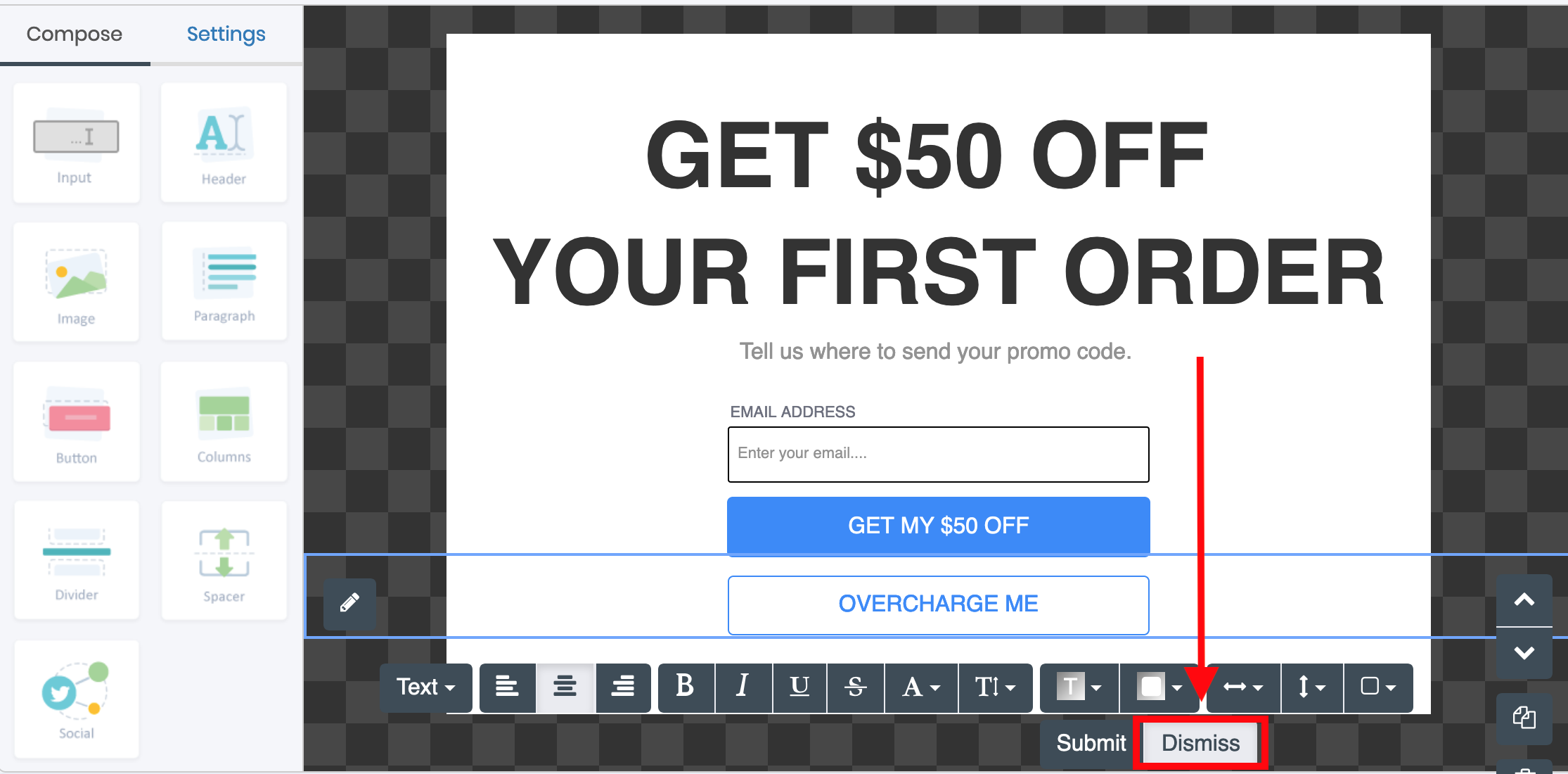 Once you've finished your button design, click on "Dismiss" on the lower right, this switches the button from doing a submit action on an email opt-in to a close action on the form, making it disappear.
