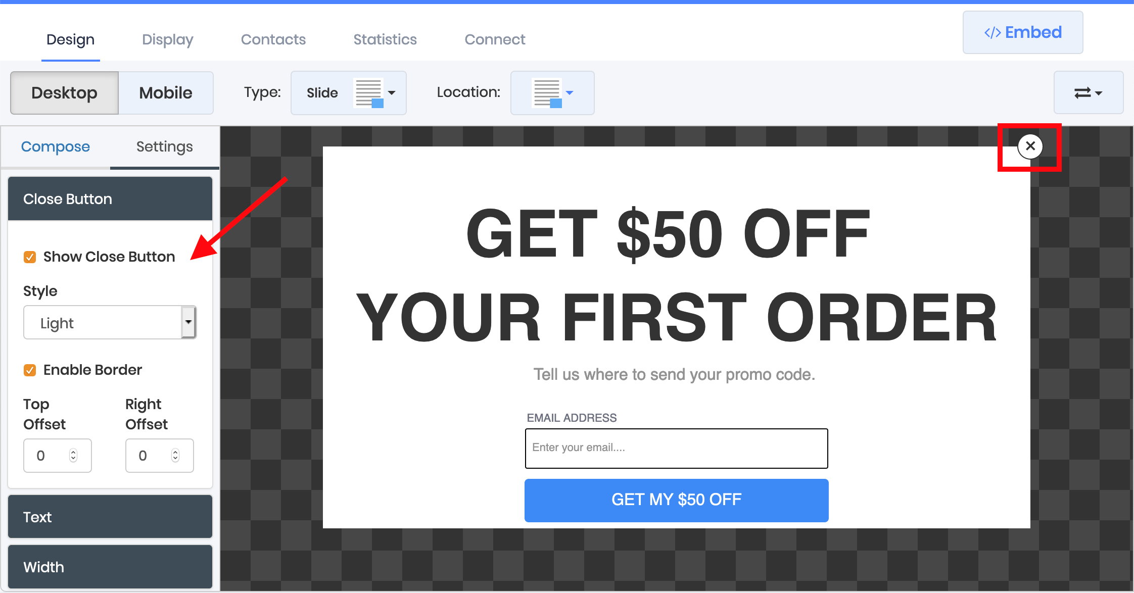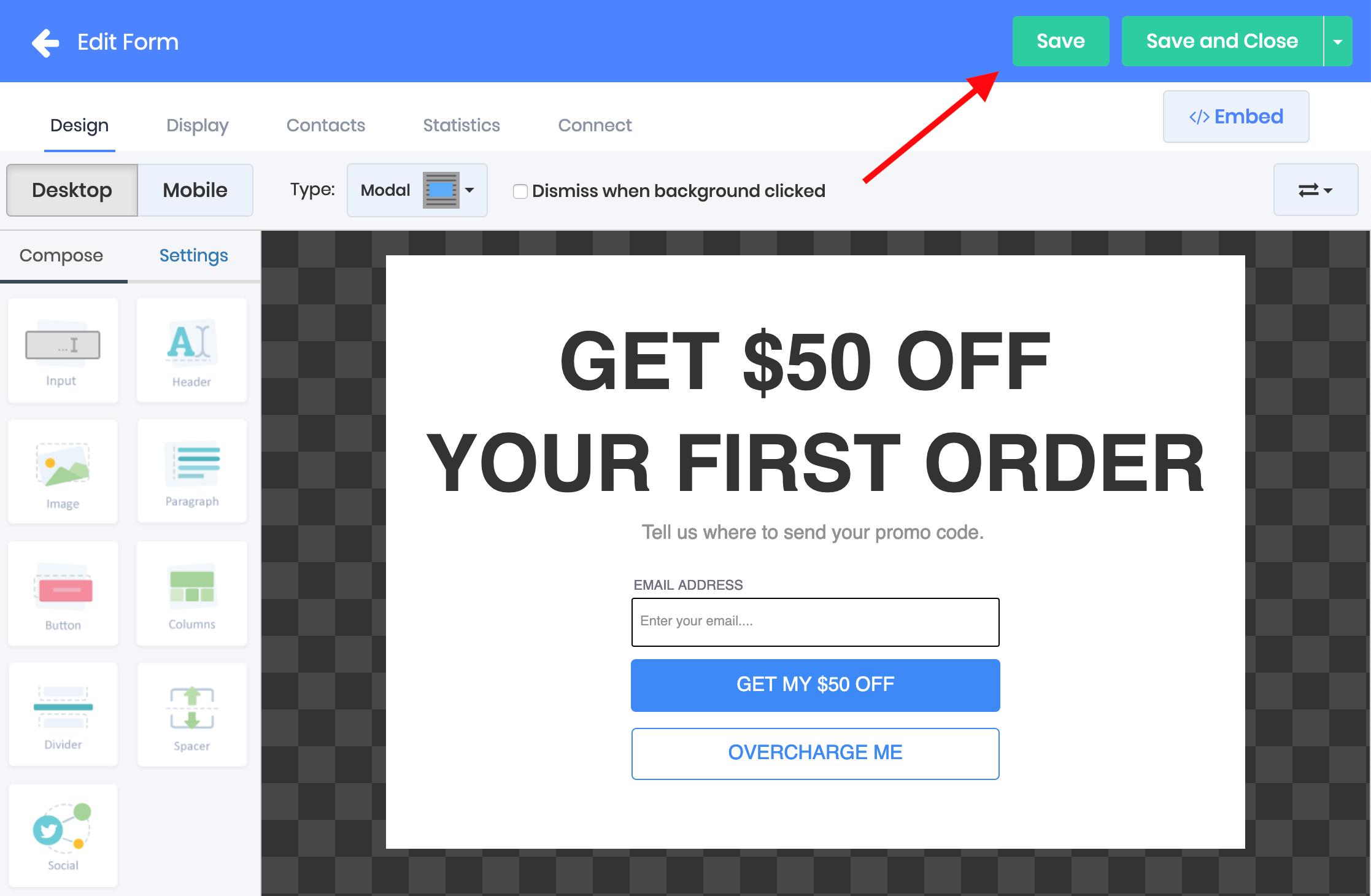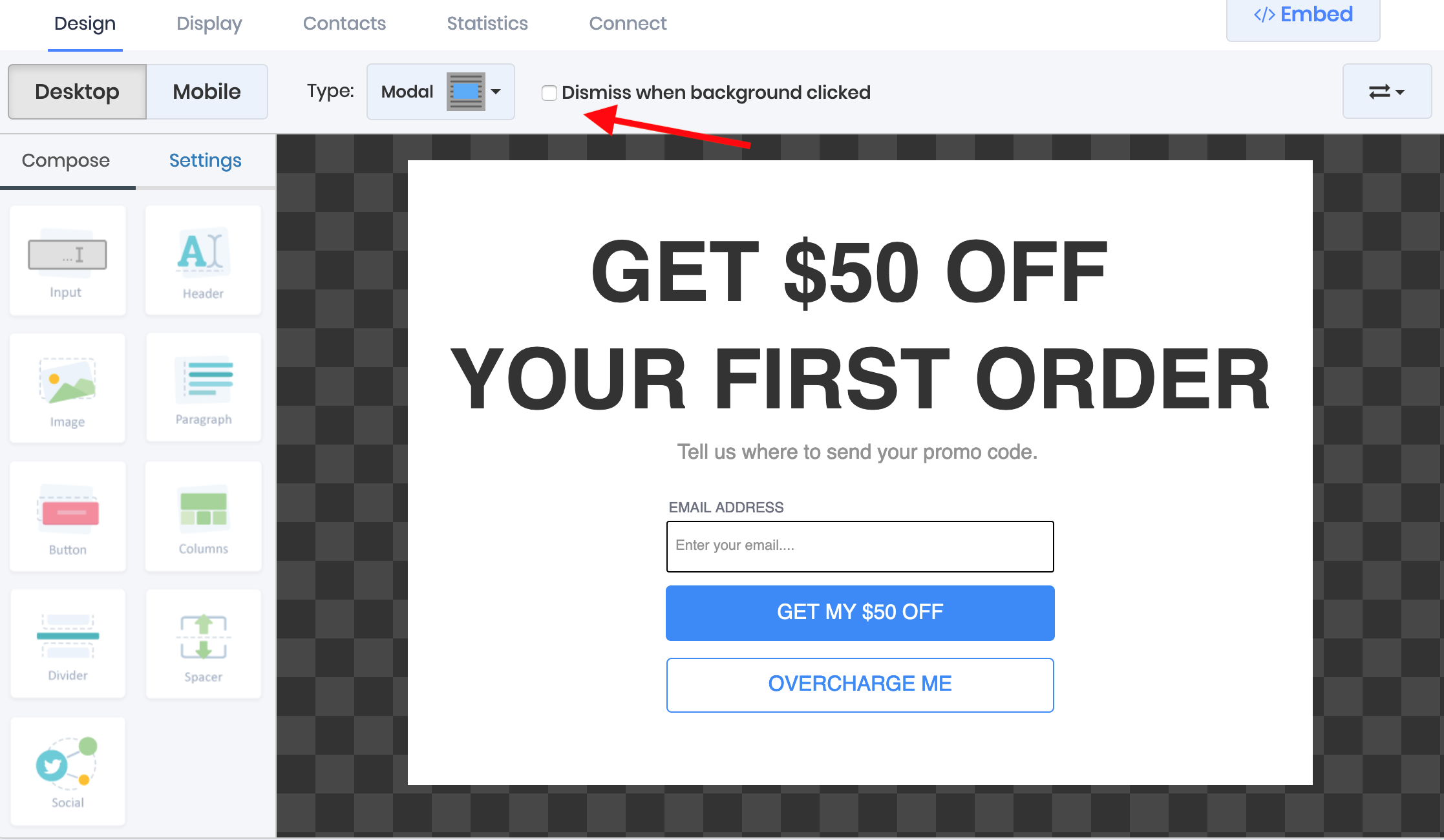 Once you've finished your button design, click on "Dismiss" on the lower right, this switches the button from doing a submit action on an email opt-in to a close action on the form, making it disappear.