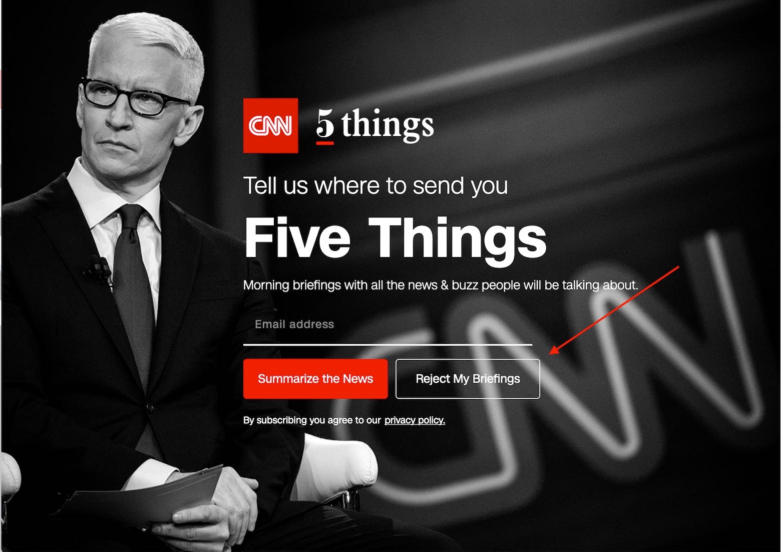 Close buttons work best when they force the visitor to make a choice, in this case you have to reject anderson coopers personal briefings and hurt his feelings instead of opting in.