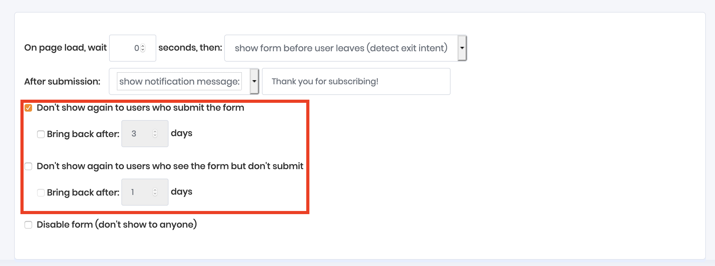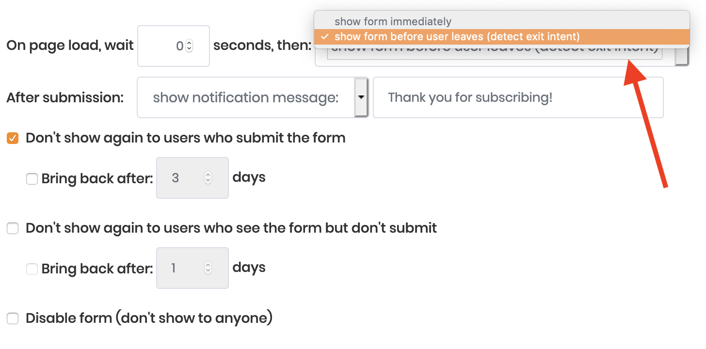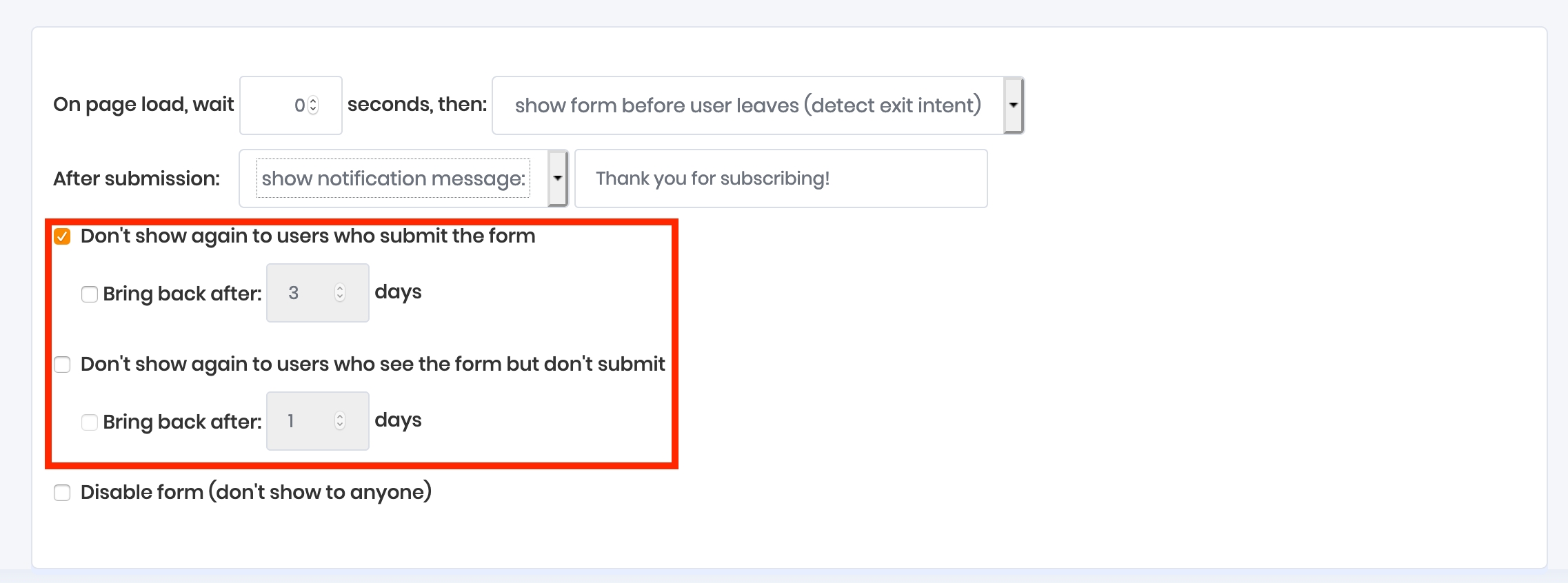 By default, visitors will be shown your form every time the page is loaded until they subscribe. Once they subscribe, the form then stop being shown to them. You can modify those settings here