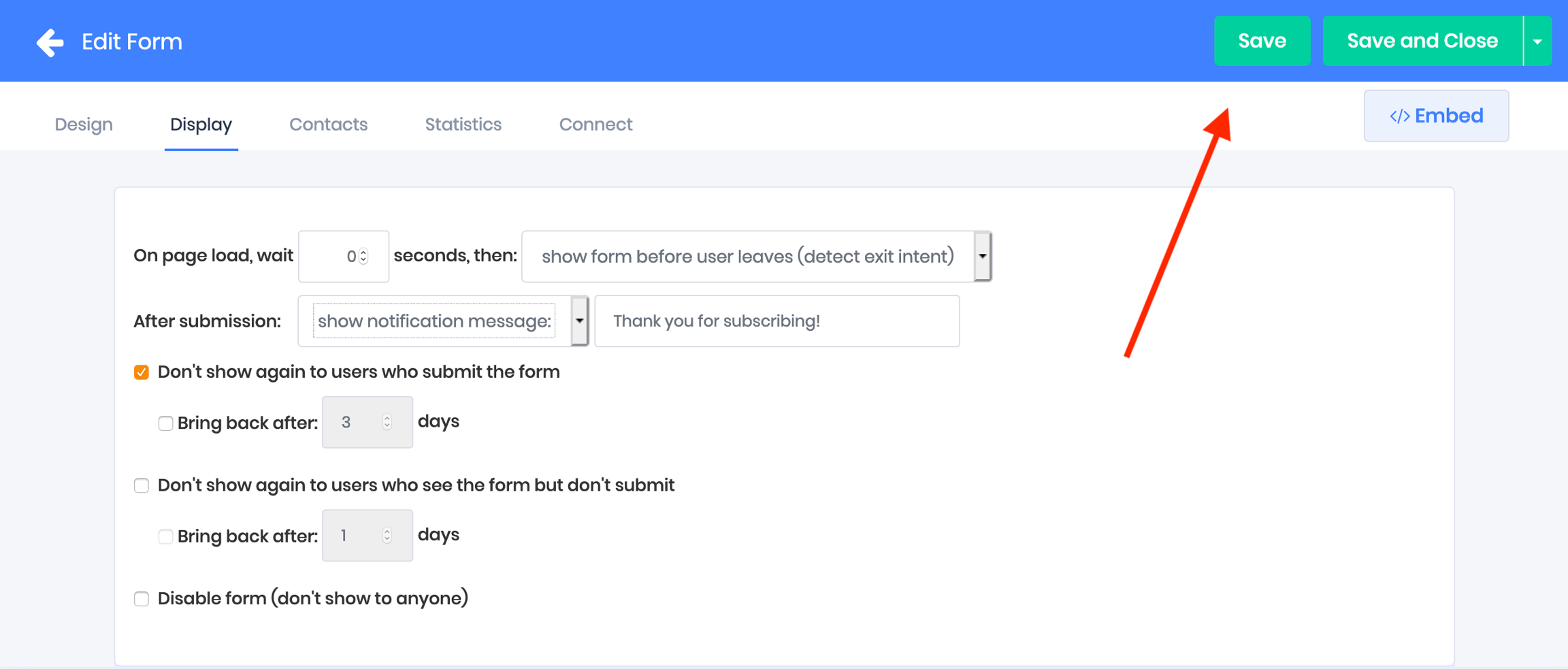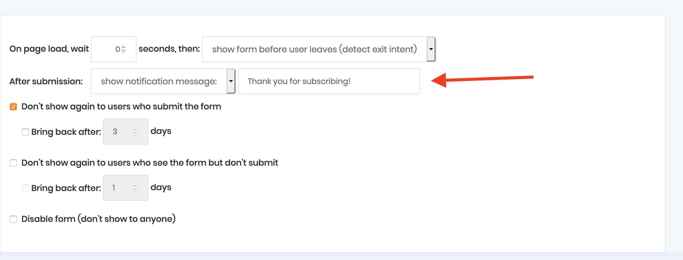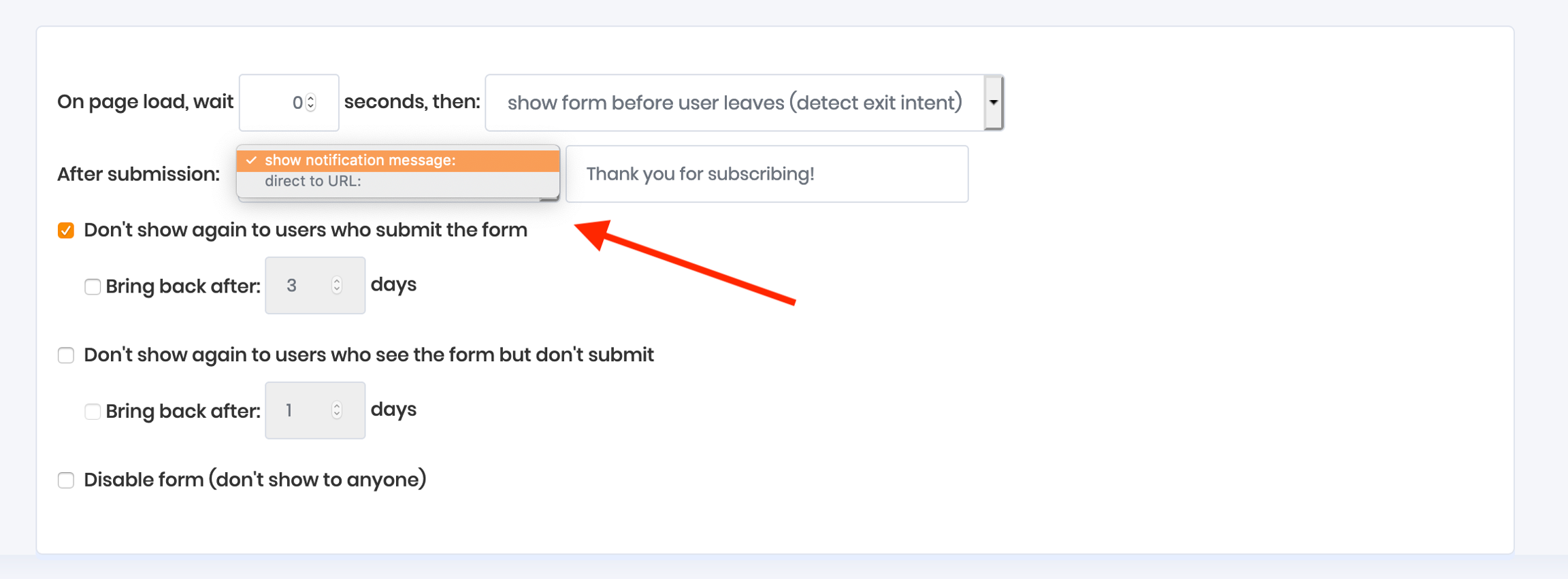 By default, visitors will be shown your form every time the page is loaded until they subscribe. Once they subscribe, the form then stop being shown to them. You can modify those settings here