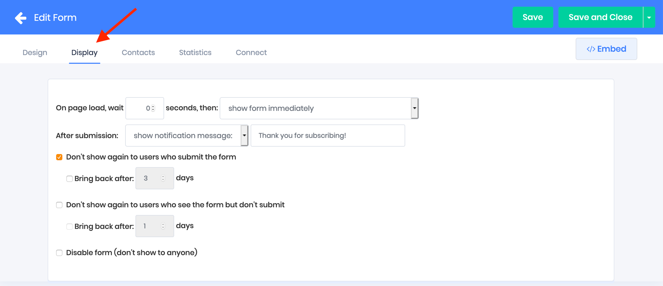 Specify how often the form should be shown to each visitor
