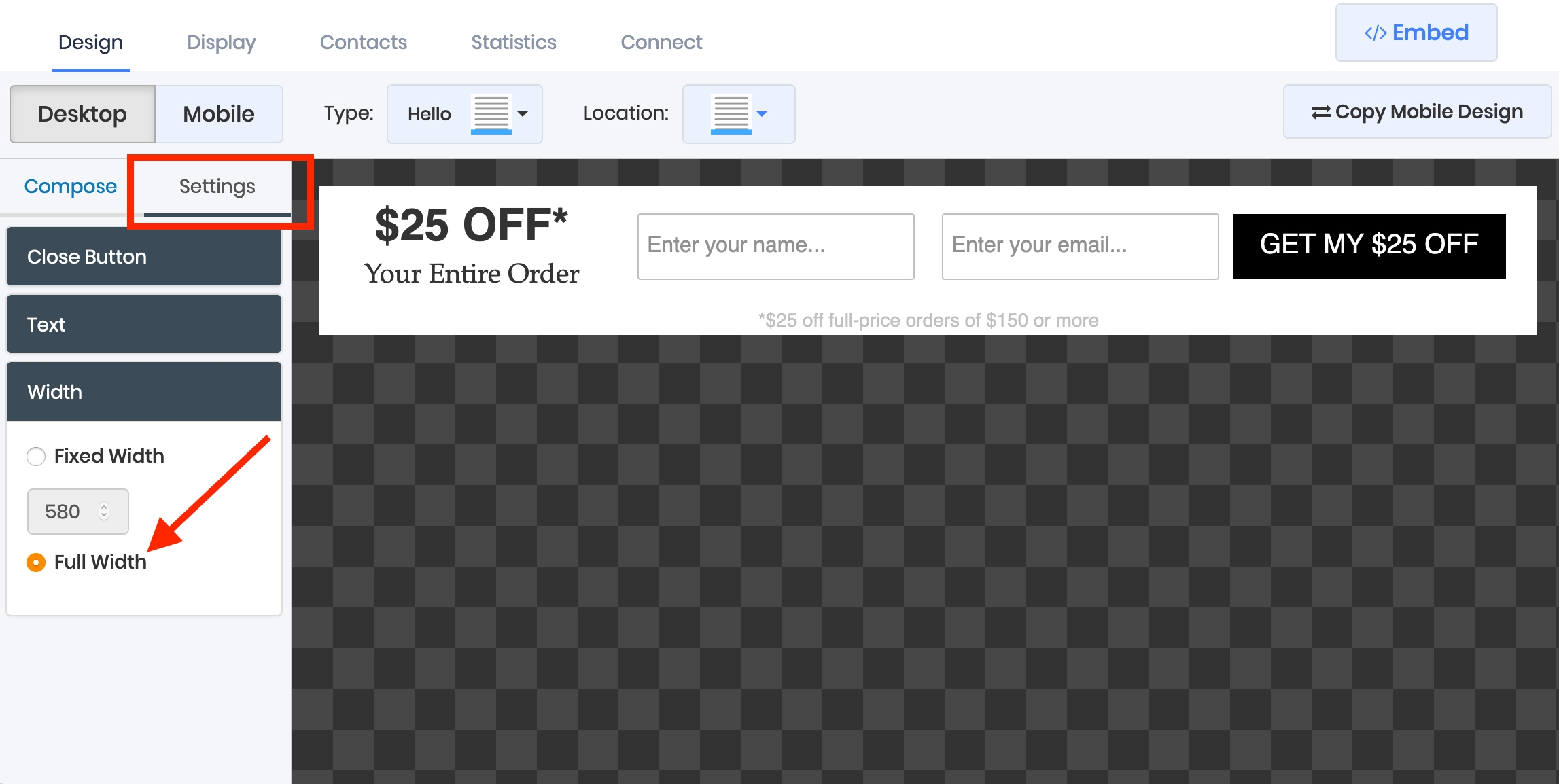 Your forms size will be determined by the width you configure under settings and how much content you add to your formHello forms and mobile optimized forms typically use the full width of the browser window instead of specifying a fixed size, as seen in the example from our hello form template below