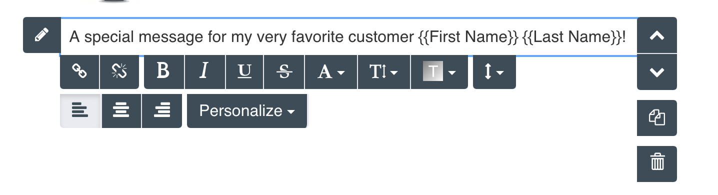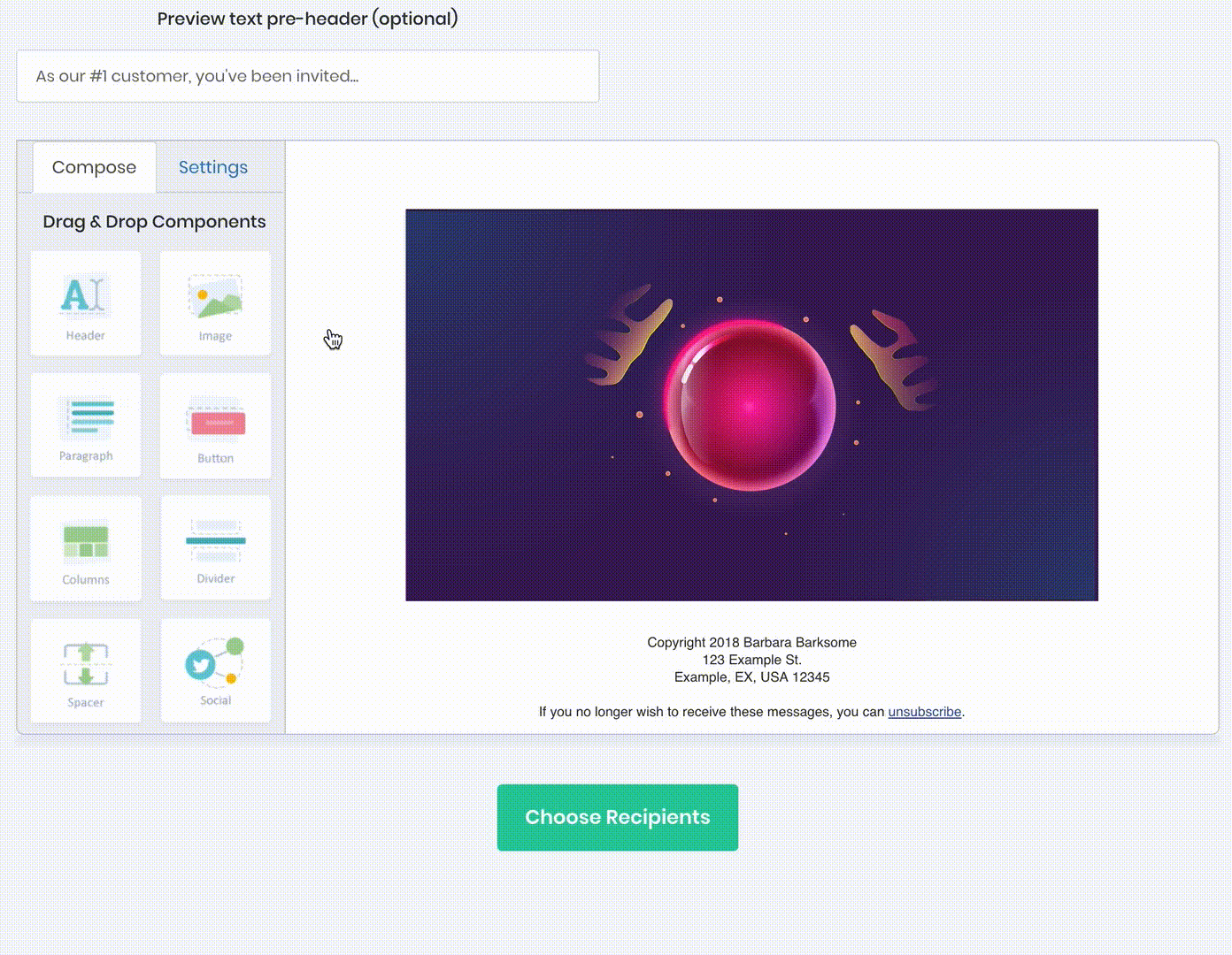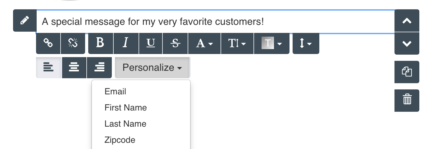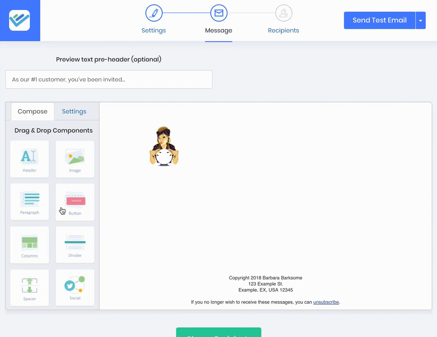To add content to your email simply drag and drop a component from the left sidebar onto your canvas, then click the component element and a toolbar will appear.